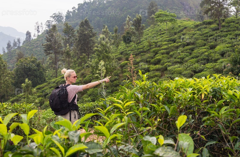 Женщина, наслаждаясь прекрасной природой чайных плантаций, Шри-Ланка