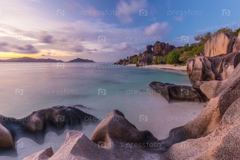 Драматический закат на пляже Анс Сурс д'Аржан, Ла Диг, Сейшельские острова
