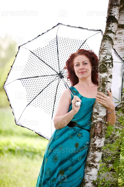Красивая женщина с зонтиком стоит у березы