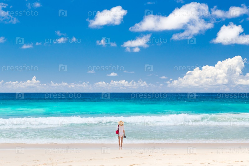 Женщина, наслаждаясь пляжем на Маэ, Сейшельские острова