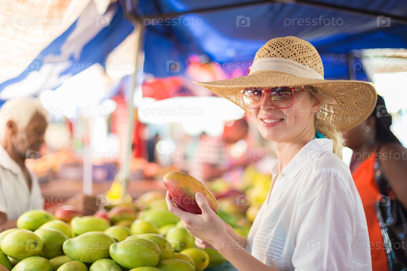 Путешественник на рынке традиционных продуктов питания Виктория, Сейшельские острова