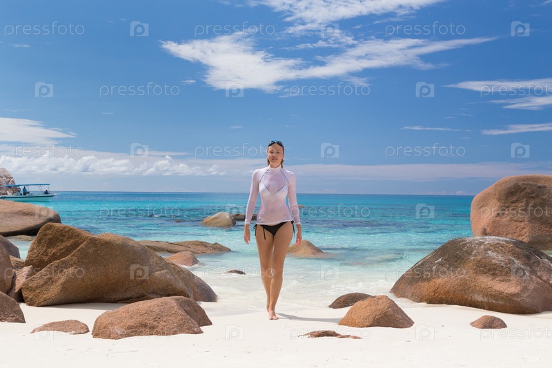 Женщина на пляже на Острове Праслин, Сейшелы