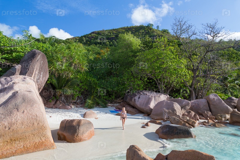Женщина на пляже на Острове Праслин, Сейшелы