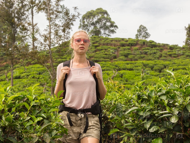 Женщина, наслаждаясь прекрасной природой чайных плантаций, Шри-Ланка