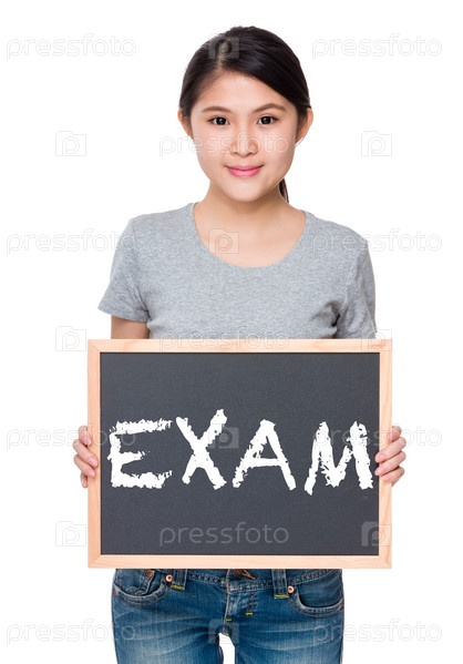 Женщина с классной доской, показывая слово экзамен