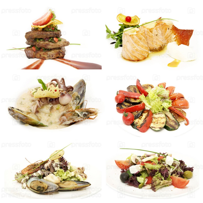 Салаты с овощами и морепродуктами в ресторане