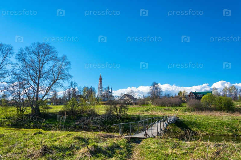 Красивый пейзаж с отражением белых облаков в голубой воде