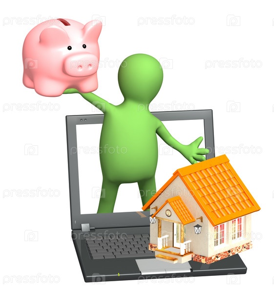 Человечек с ноутбуком, копилкой и домиком