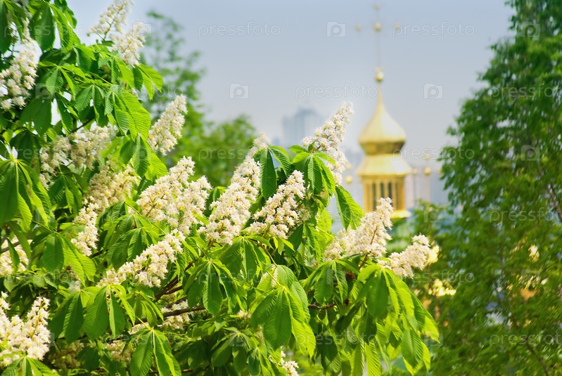 Цветущие ветви конского каштана на фоне церкви