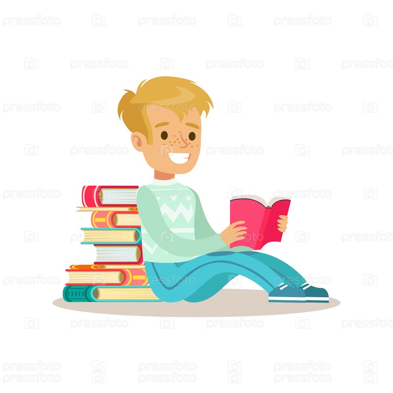 Мальчик сидит спиной к стопке книг
