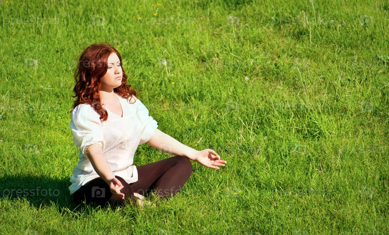 Красивая шатенка сидит в позе лотоса на зеленой лужайке