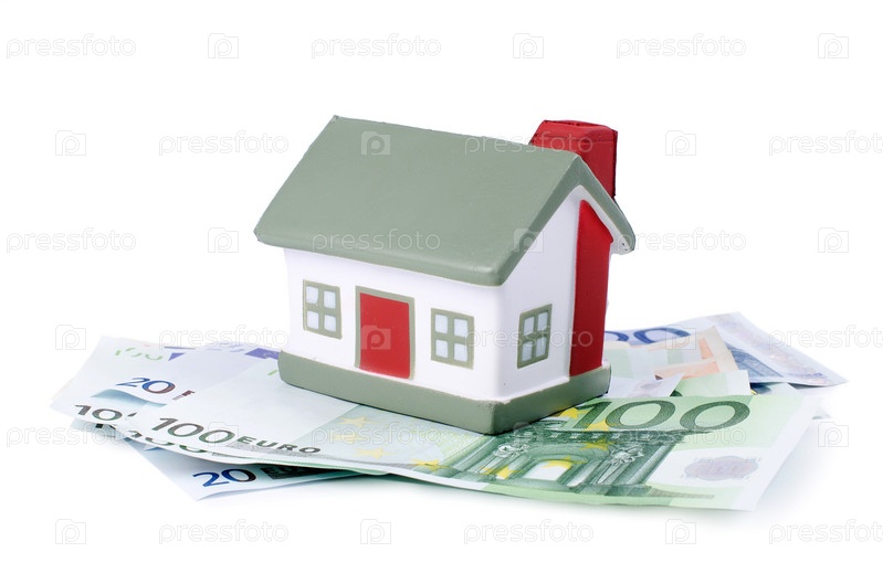 Игрушечный дом на банкнотах евро, изоляция на белом фоне