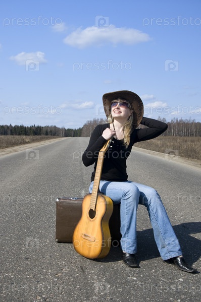 Хорошенькая девушка сидит на дороге с багажом