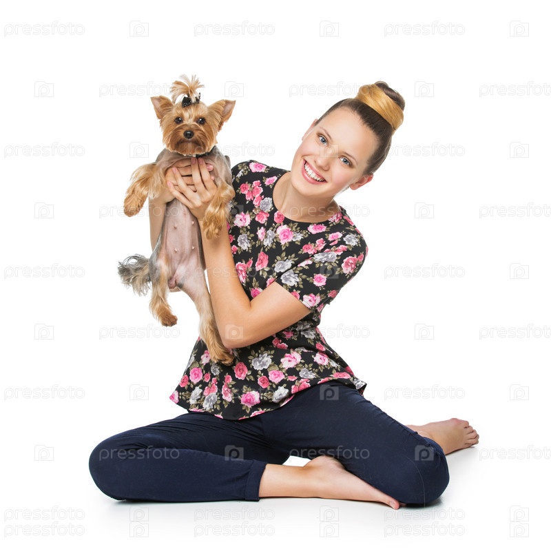 Девушка с собакой породы йоркширский терьер
