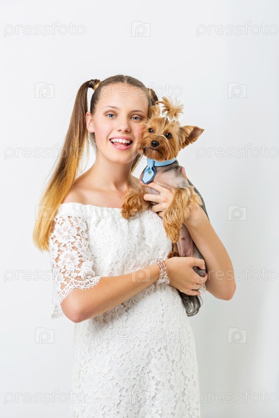 Девушка с собакой породы йоркширский терьер