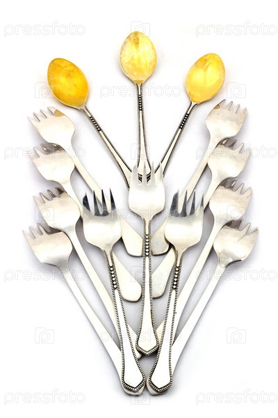 Десертные ложки и вилки на белом фоне