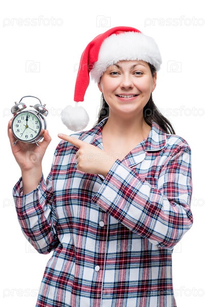 Девушка в пижаме и рождественской шапке с будильником