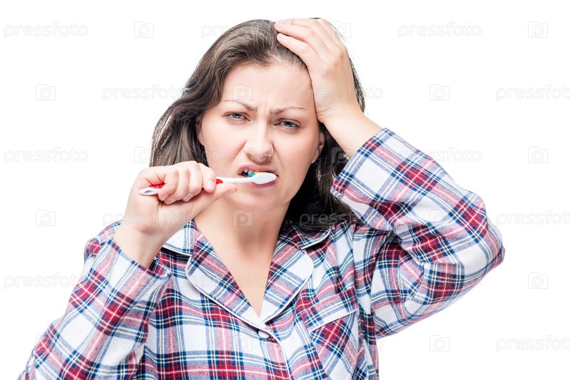 Сонная неудовольная женщина чистит зубы после пробуждения