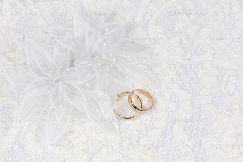 Золотые обручальные кольца на белых кружевах