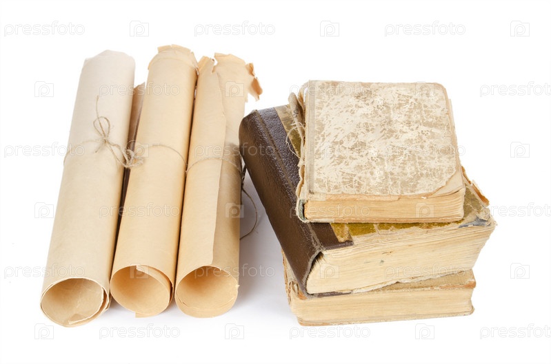 Несколько древних свитков и книг, изолированных на белом фоне