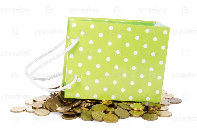 Яркий подарочный пакет и монеты, изолированные на белом фоне