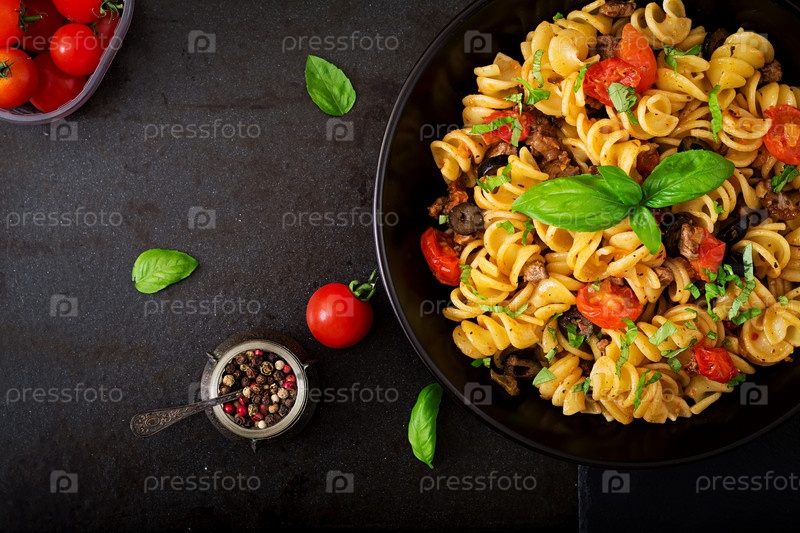 Паста с помидорами, говядиной и базиликом