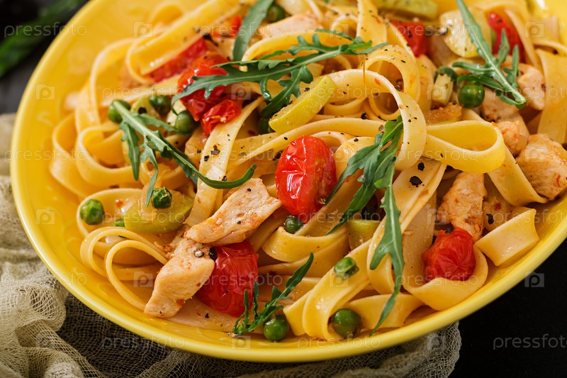 Паста Феттучини с помидорами, цукини и куриным филе