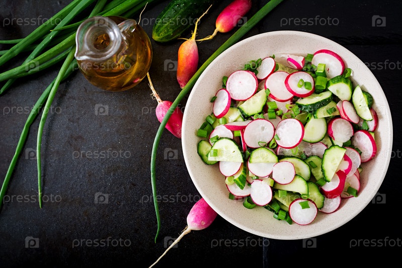 Свежий салат из огурцов, редиса и зеленого лука