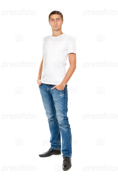 Красивый молодой человек в белой футболке и джинсах, изолированный на белом фоне