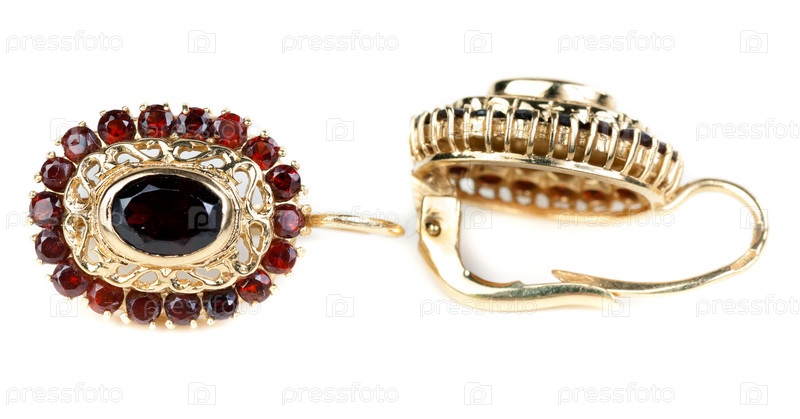 Золотые серьги с рубинами, изолированные на белом фоне