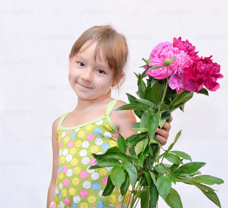Ребенок с букетом цветов на светлом фоне