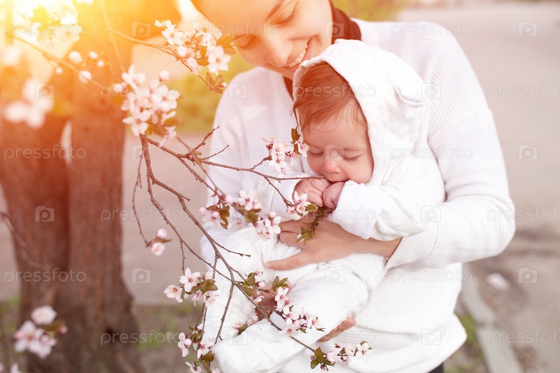 Ребенок с мамой в весеннем саду