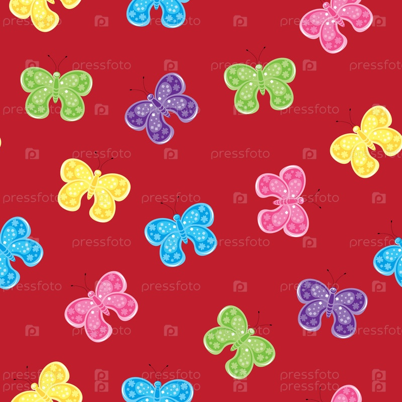 Бесшовный шаблон с яркими бабочками. Иллюстрация на красном фоне