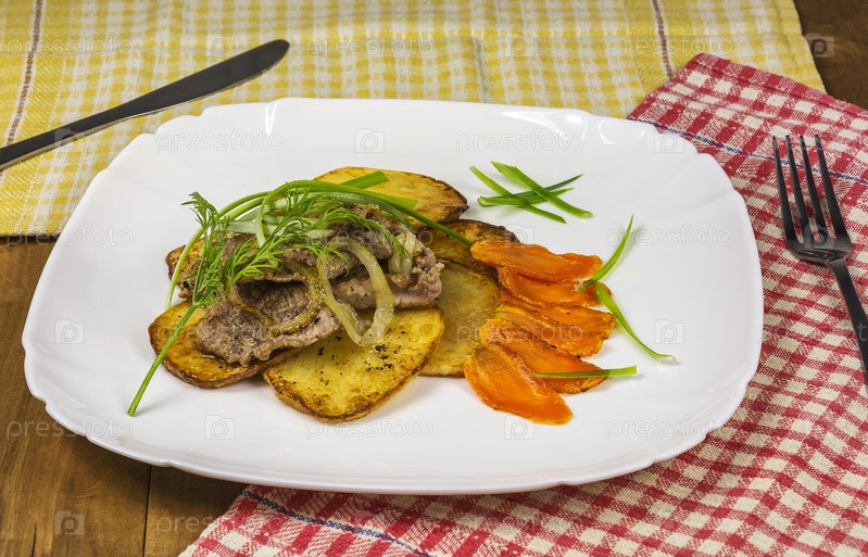 Ломтики жареного картофеля и мяса