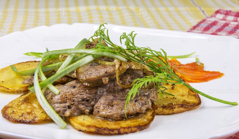 Ломтики жареного картофеля и мяса