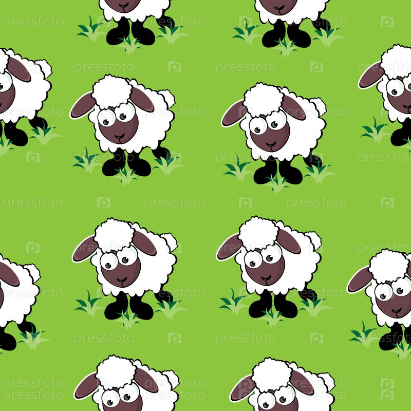 Бесшовный шаблон с мультипликационными овечками на зеленом фоне
