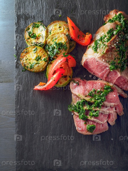 Ростбиф с жареными цуккини, перцем и сальсой