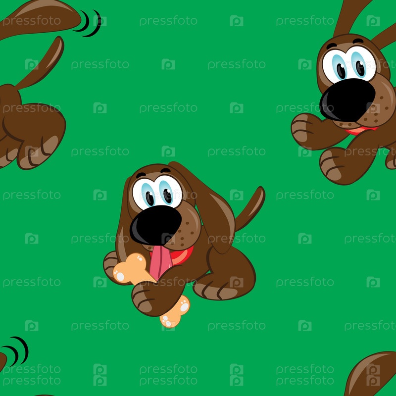 Бесшовный шаблон с мультипликационными собаками на зеленом фоне