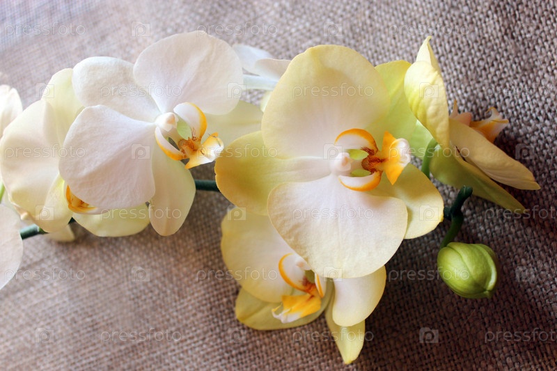 Ветвь цветущей желтой орхидеи на мешковине