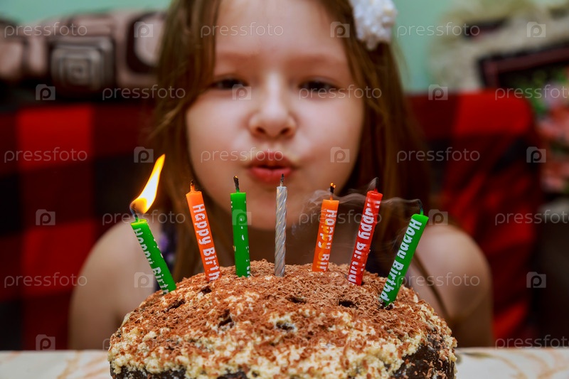 Маленькая девочка дует на свечи в День рождения