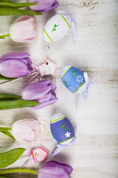 Фиолетовые тюльпаны и пасхальные яйца