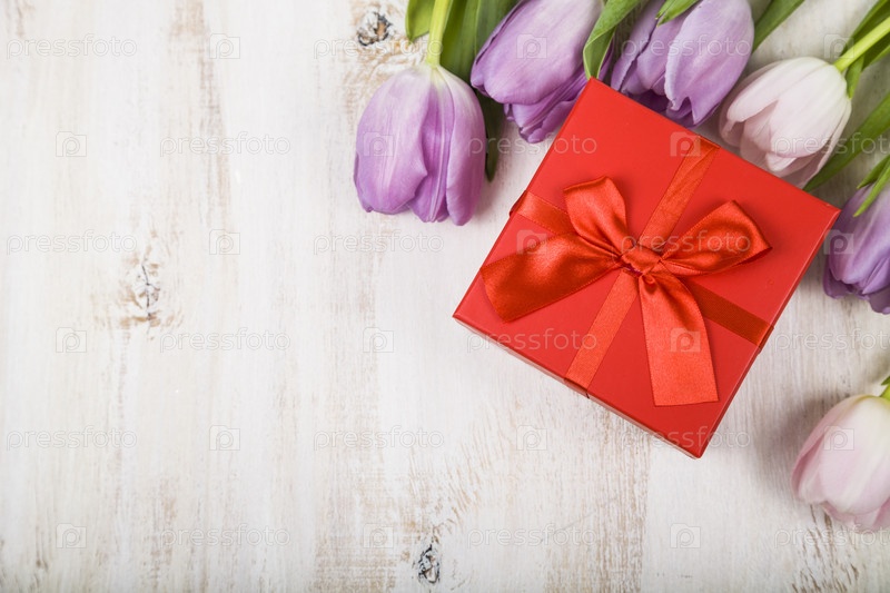 Букет из тюльпанов и подарок на деревянном фоне