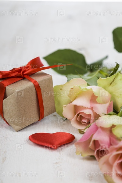 Розовые розы, подарок и сердце