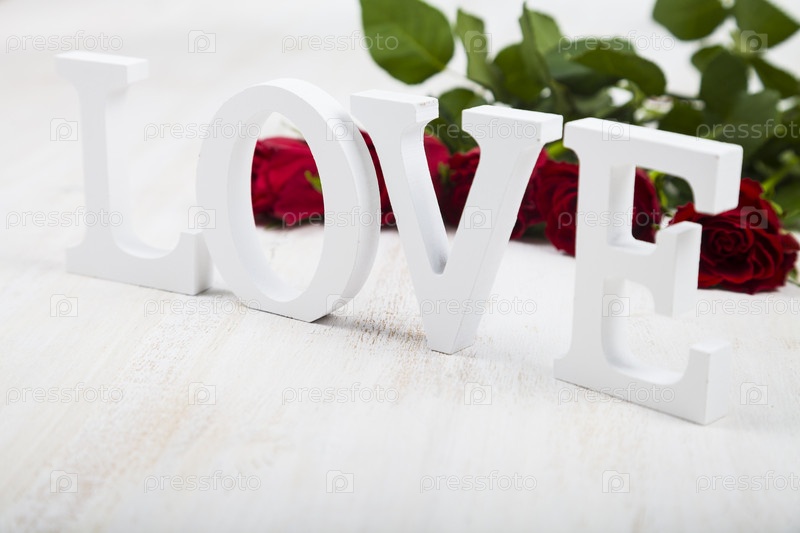 Красные розы, сердце и слово «любовь»