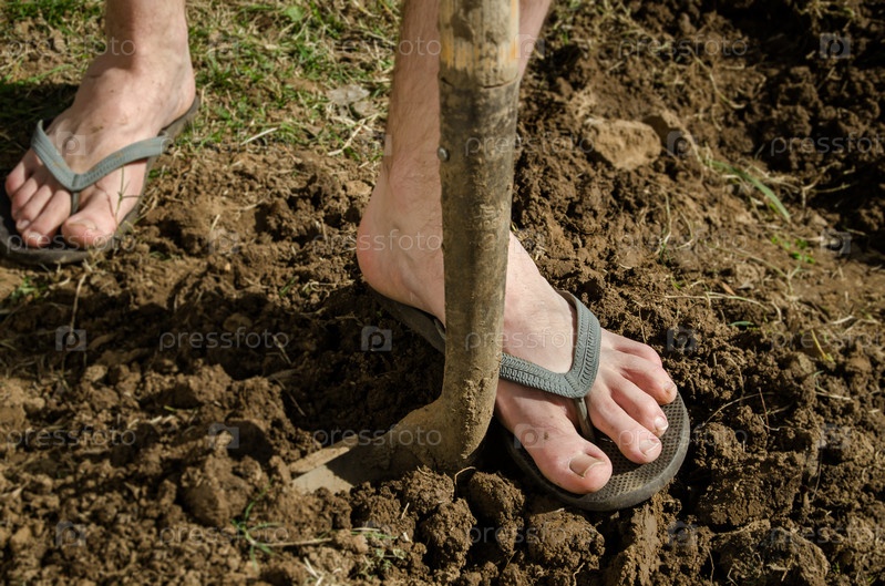 Ноги мужчины в шлепанцах, копающего землю лопатой