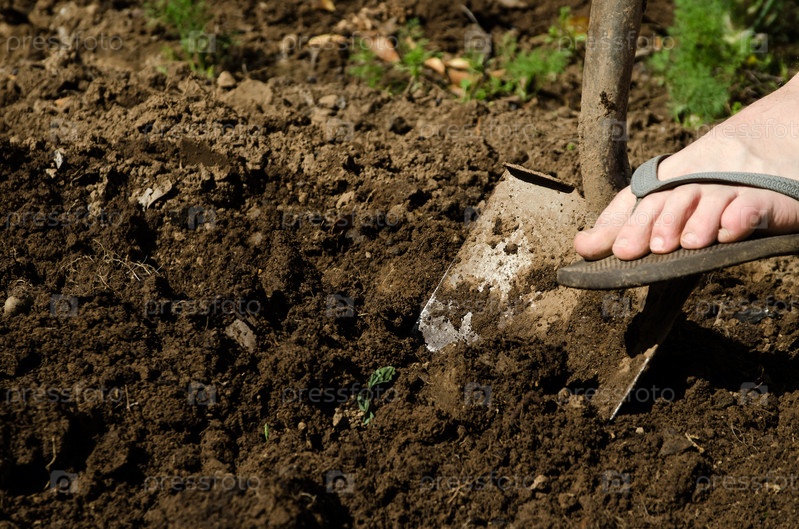Ноги мужчины в шлепанцах, копающего землю лопатой