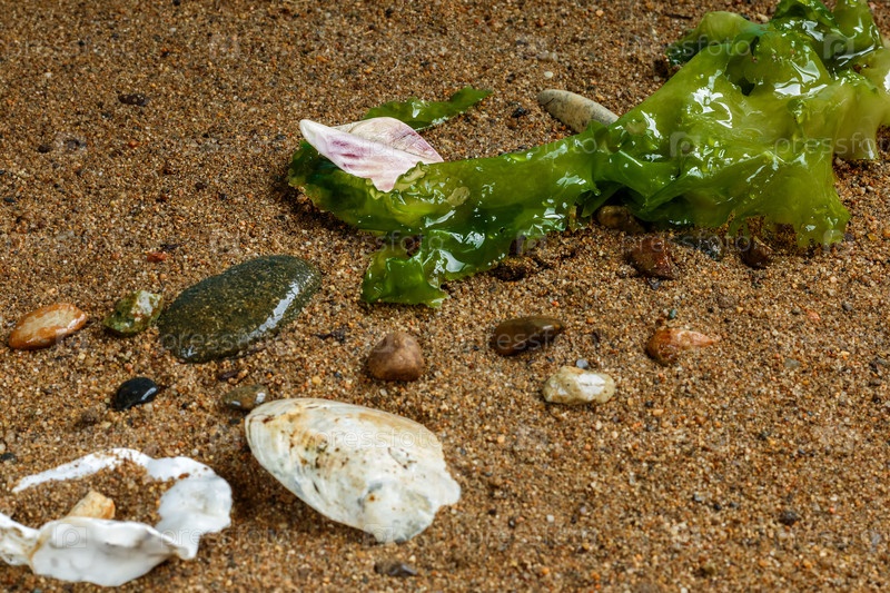 Водоросли и ракушки на песке