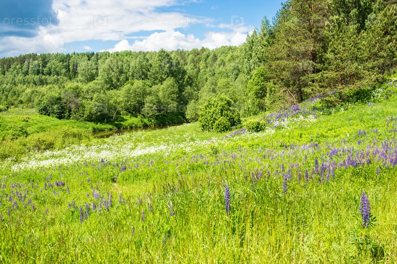 Красивый склон с фиолетовыми и белыми цветами