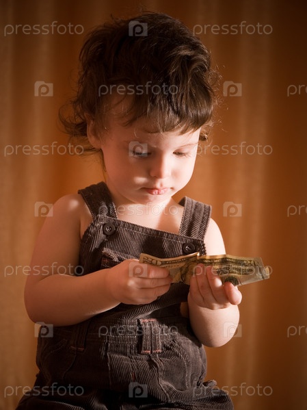 Малыш внимательно разглядывает денежную купюру