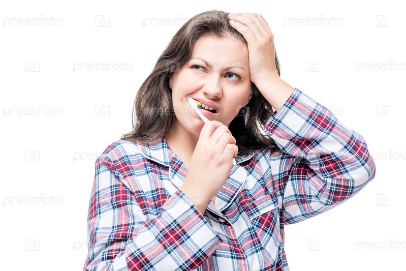 Недовольная женщина чистит зубы утром